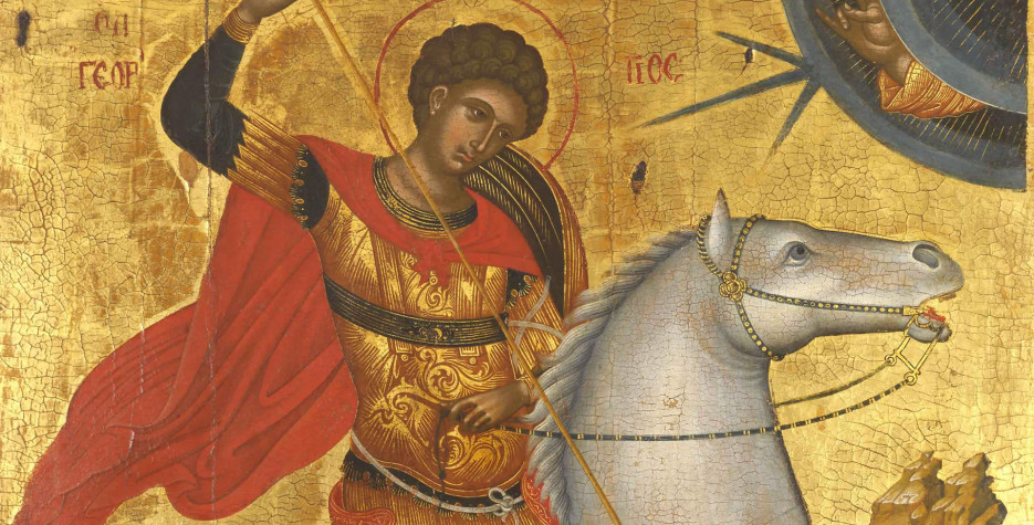 Saint Georges est un martyr du IVe siècle après J-C. Officier valeureux de l'armée romaine, il mène une brillante carrière militaire jusqu'au jour où l'Empereur Dioclétien lui demande d'adorer les divinités romaines : il s'y refuse et proclame avec audace sa foi en Jésus-Christ. Il subira alors de douloureuses persécutions mais - fait miraculeux - il sortira indemne de toutes : on le fait tour à tour jeter dans un puits, avaler du plomb fondu, brûler dans un taureau de bronze chauffé à blanc, donner en nourriture à des oiseaux de proie...